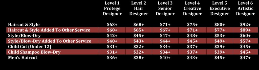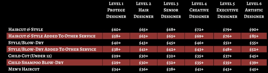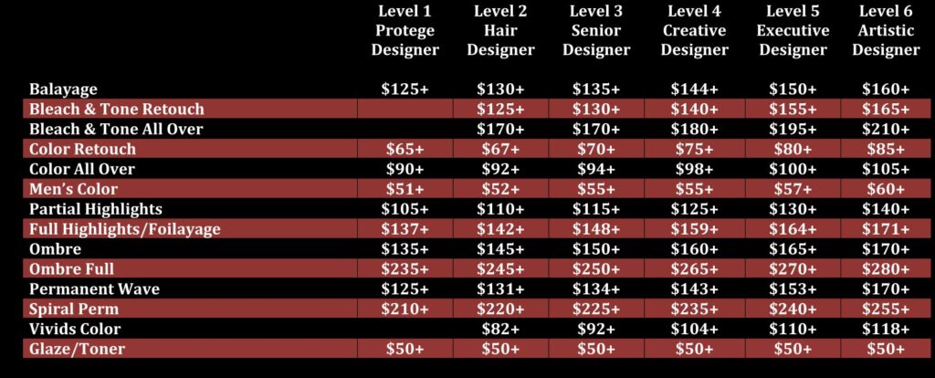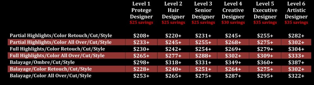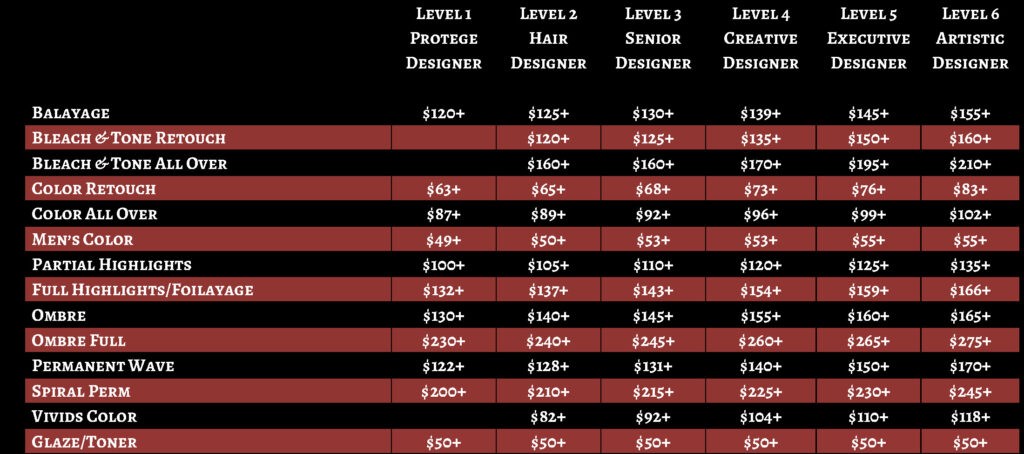 Our prices display a “Starting At Price +” and vary according to Designer’s experience, advanced education they receive, demand, as well as condition, length, thickness and amount of product used for guest’s hair. Feel free to request a stylist in the price range you are comfortable with. Please consult with your Designer if you are uncertain. see our faq section for more details.